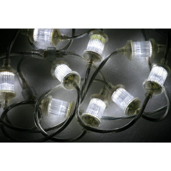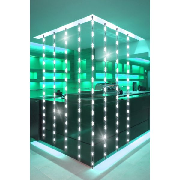 - Modular setup for extreme flexibility: you can start with the basic “starter package” containing a sound controller and 3 LED strings (total = 12 WHITE lamps) to end up with a huge LED curtain.